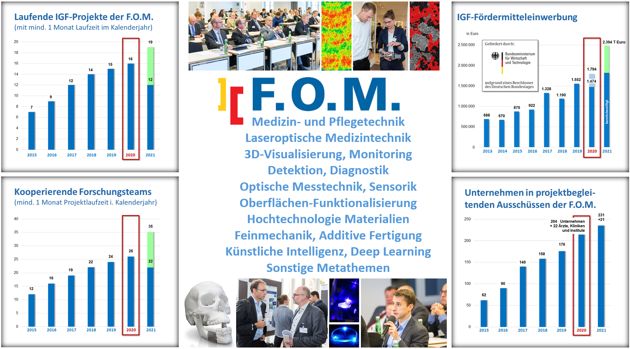 "Besonders stolz sind wir darauf," sagt Markus Safaricz, Geschäftsführer der F.O.M., "dass wir in 2020 über 200 überwiegend mittelständische Industrieunternehmen sowie über 20 niedergelassene Ärzte, Kliniken und Institute mit Technologie-Knowhow aus neuen Forschungsergebnissen beliefern konnten, also dreieinhalb mal so viele wie noch vor fünf Jahren. Gleichzeitig unterstützen wir mit unseren Projekten die Ausbildung des Fachkräftenachwuchses."